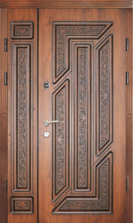 Поскольку в большинстве случаев устанавливаемые на входе в коттедж двустворчатые двери являются еще и предметом интерьера, украшающим здание, их дизайну предается особое значение. Эти двери, как правило, отделываются атмосферостойким МДФ, натуральным шпоном, массивом. Эффектно на таких дверях смотрится витражный узор, применение ковки, зеркальных элементов. Вариантов декора входной двустворчатой двери масса, тут все зависит от пожеланий заказчика.